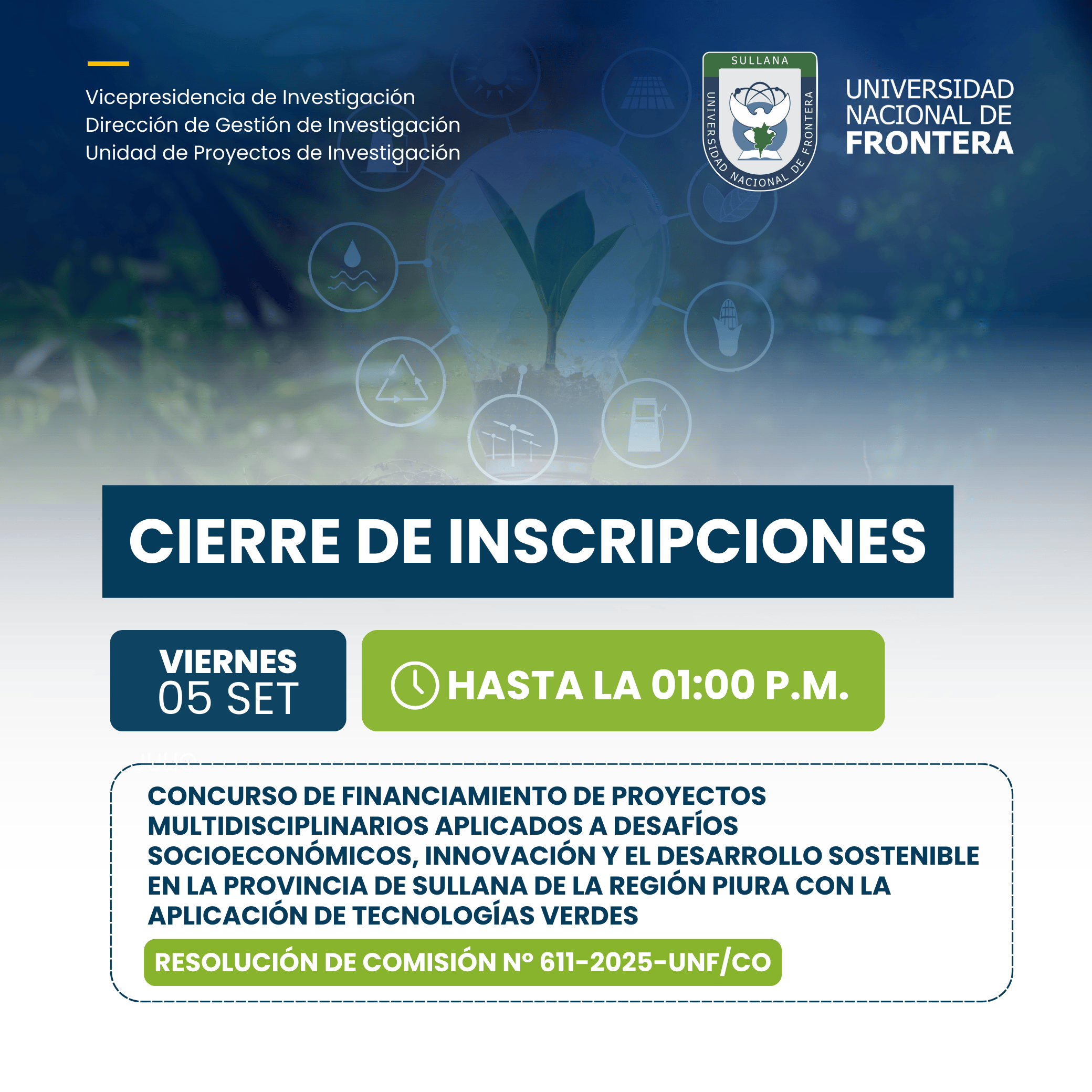 La Universidad Nacional de Frontera (UNF), a través de la Vicepresidencia de Investigación, la Dirección de Gestión de Investigación y la Unidad de Proyectos de Investigación, recuerda a los docentes investigadores integrantes de grupos de investigación UNF que se encuentra próximo el cierre de inscripciones del Concurso de Financiamiento de Proyectos Multidisciplinarios aplicados a desafíos socioeconómicos, innovación y el desarrollo sostenible en la provincia de Sullana, región Piura, con la aplicación de tecnologías verdes.