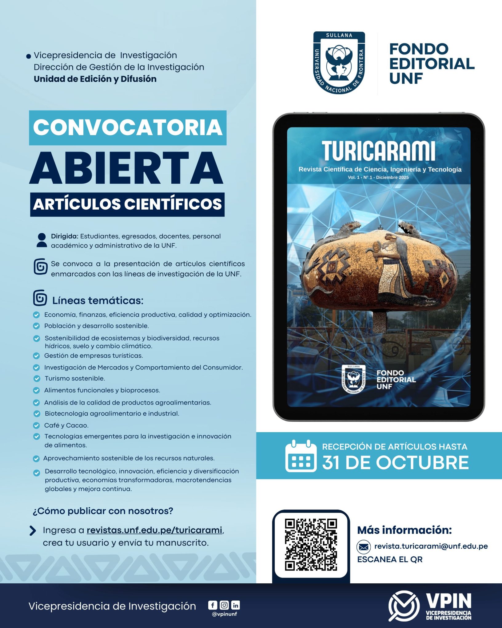 La Universidad Nacional de Frontera (UNF) – Sullana anuncia la convocatoria abierta para la publicación de artículos científicos en su revista Turicarami, especializada en ciencia, ingeniería y tecnología.
